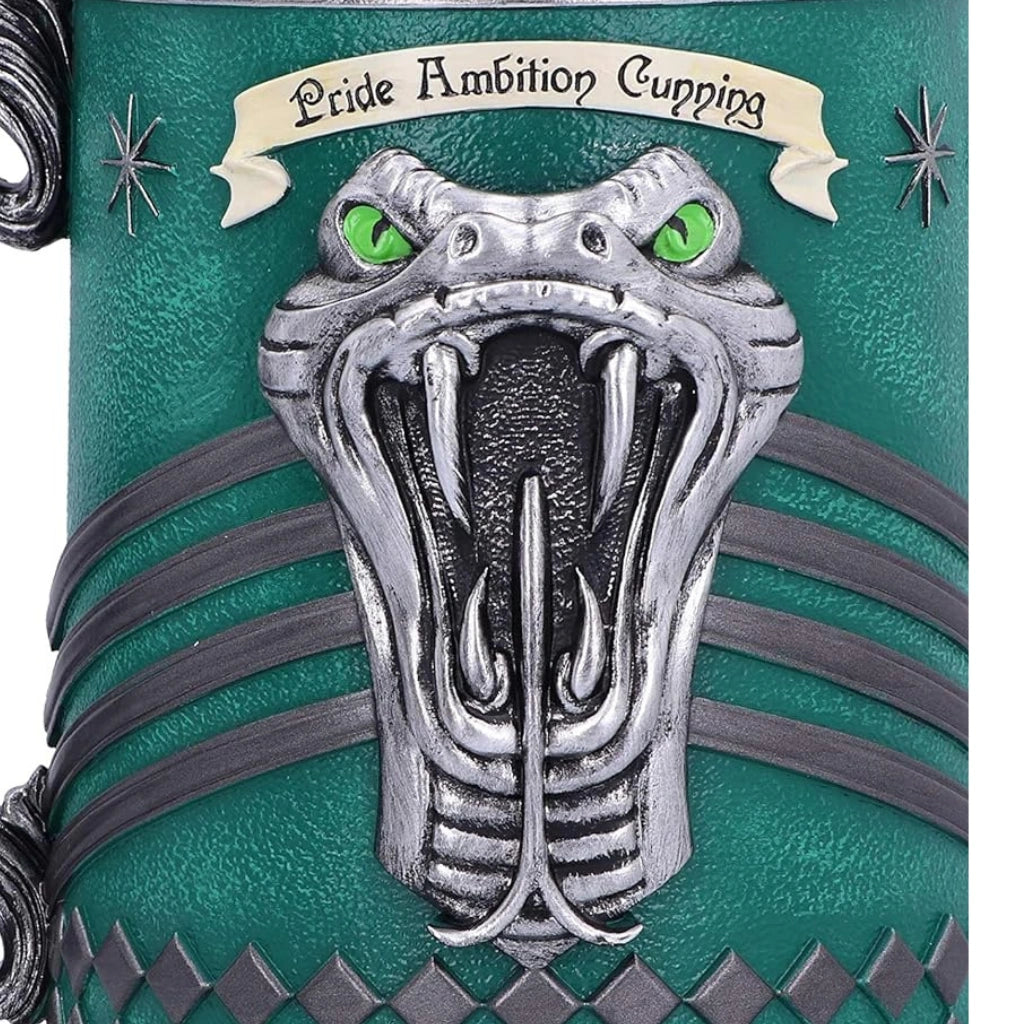 A Caneca Harry Potter Sonserina é um item indispensável para os admiradores da casa Sonserina. Feita de metal, a caneca apresenta o escudo da casa de um lado e a serpente, mascote da Sonserina, do outro. A alça é decorada com a serpente, adicionando um detalhe exclusivo e sofisticado.